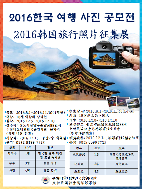 ㅇ通过韩国旅行时的照片表现对韩国的热爱,传播韩国文化,增进对韩国的了解, 大韩民国驻青岛总领事馆以山东省内18岁以上的中国人为对象举办2016韩国旅行照片征集展,请大家多多参与。